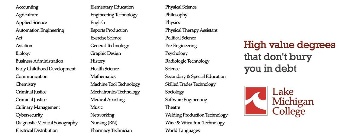 - At Lake Michigan College, we believe in making education work for you. LMC offers high quality programs allowing you to invest in yourself without the financial stress. Our graduates consistently report a high return on investment, with the skills and knowledge to excel in their chosen careers or pursue advanced degrees. We provide a supportive learning environment and student learning resources that are built for you to achieve your academic and career goals. From dedicated faculty to career counseling services, LMC equips you with the tools you need to succeed.